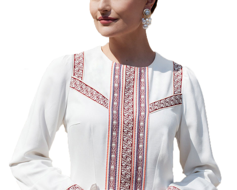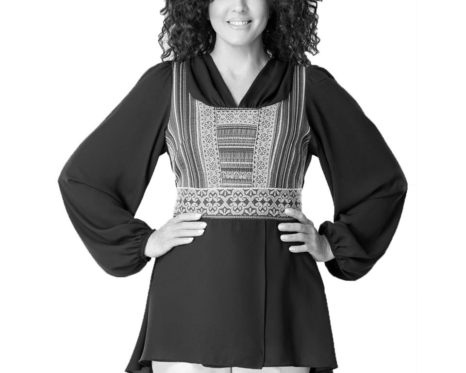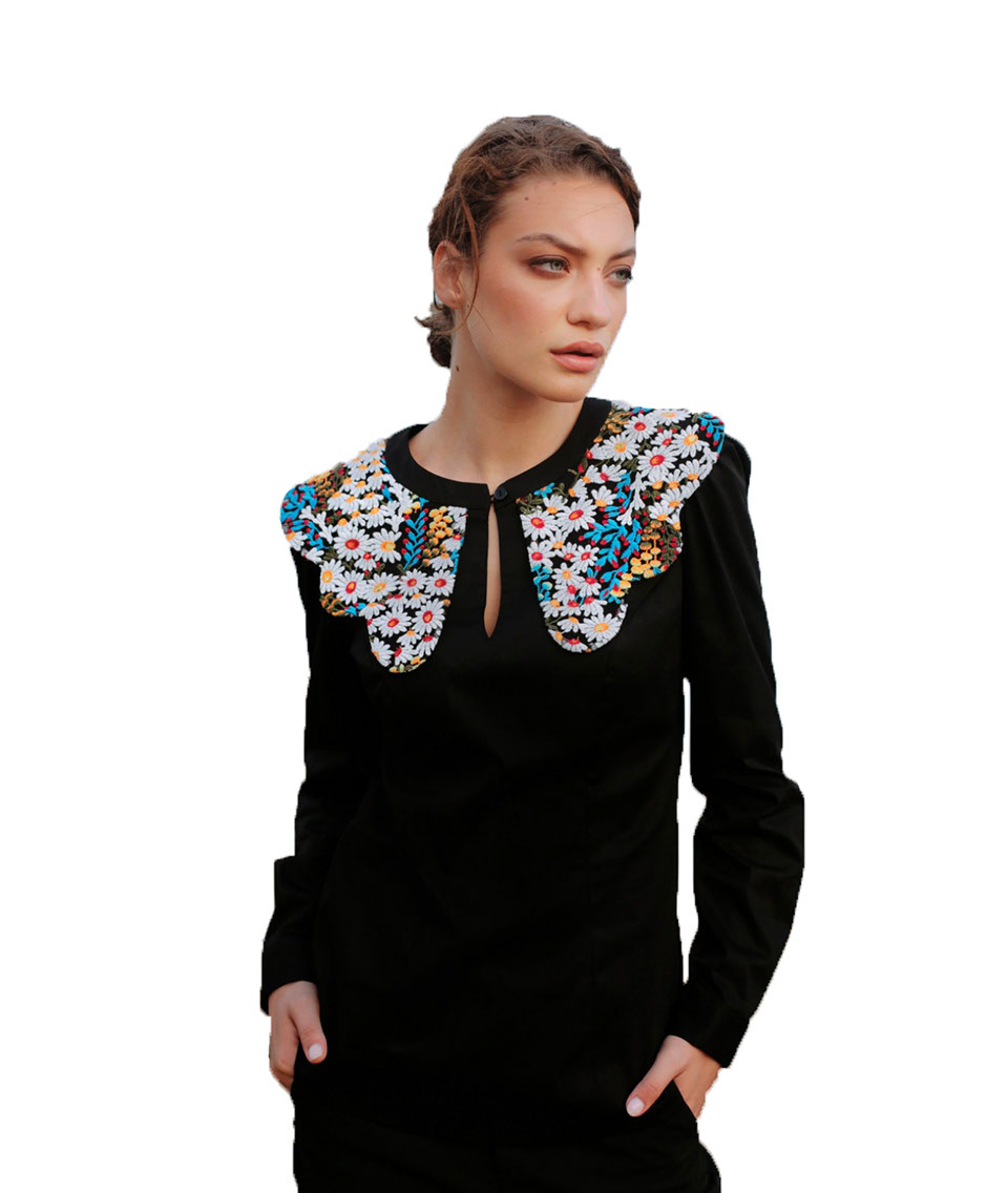 Camasa Retro-Folk este confectionata din bumbac si elastan cu epoleti si mansete din jacquard etnic tesut cu motive florale si geometrice. Camasa are o croiala cambrata, cu decolteul in anchior, mansetele si epoletii din jacquard etnic tesut. Camasa Retro-Folk are manecile foarte feminine, inspirate din moda anilor '30.