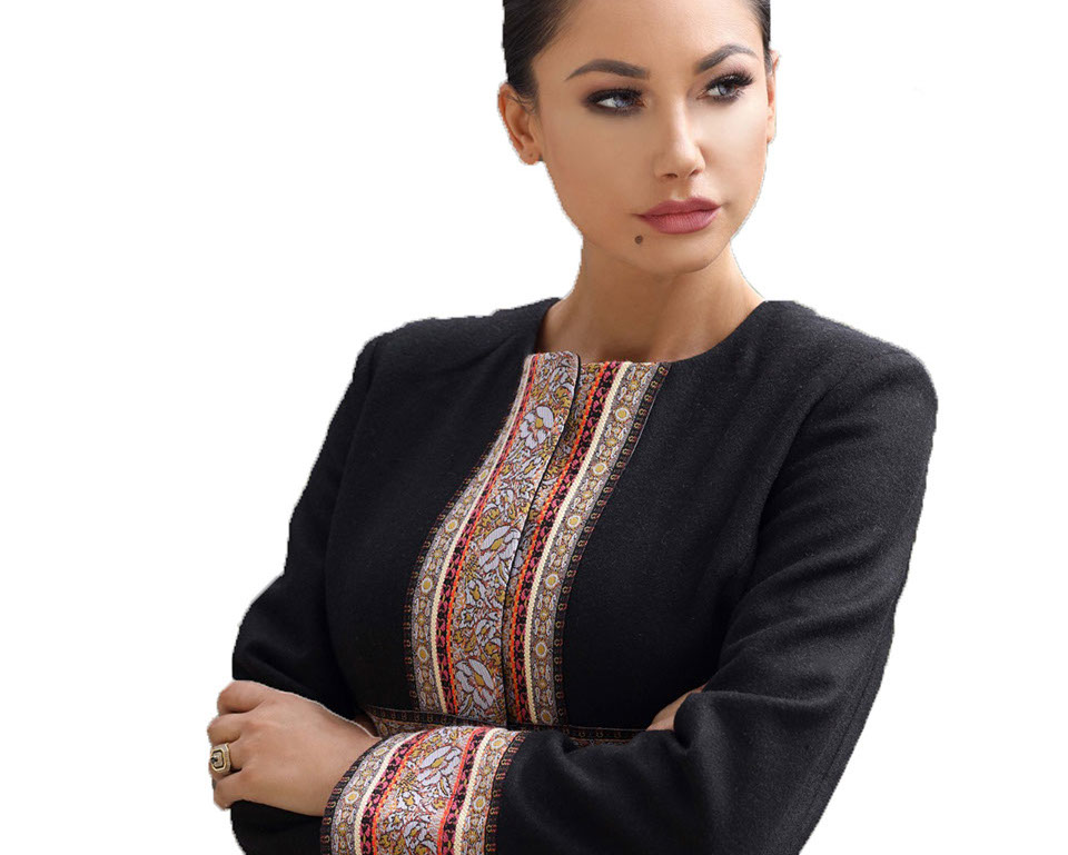 Pardesiul are cu croiala clasica, esta captsuit si se inchide parte peste parte cu capse ascunse, are o croiala dreapta dar usor cambrata pe spate, cu buzunare laterale ascunse. Broderia tesuta de matase pe care o regasim pe fata si la mansetele late are un mix de nuante extrem de rafinate, care se potrivesc in orice perioada a zilei dar si pentru o tinuta eleganta de seara, cu un accent etnic special.